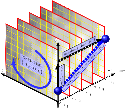 [1] r2 − (cti)2, or, along the x-axis only: ∥s∥ = px2 − (cti)2. Alternatively, the complextime modulus provides a time-time interval, equivalent to the proper time τ in special rel-