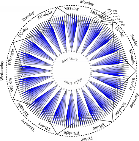 Then he moves on to analyze the night of the circulated day of Monday in the same way, but starting from the day-time of Friday, and so on for the full seven Days, as indicated in the following Table 4.5 and Figure 4.12.