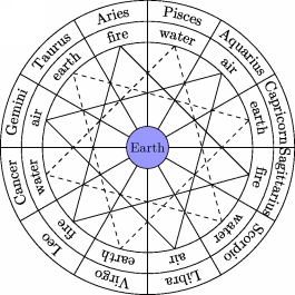 Figure 7.2: The twelve zodiacal signs are divided into four groups whose influences are related to the four elements: earth, water, air and fire; hence each group contains three signs of the same nature.